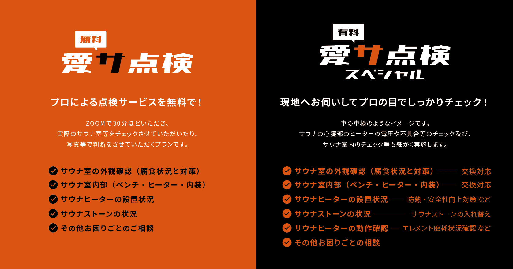 「サウナのもしも」の瞬間にいち早く対応し、迅速な初動対応を支援します。また、適切な防火対策やメンテナンスをサポートする「愛サ点検」も実施中。